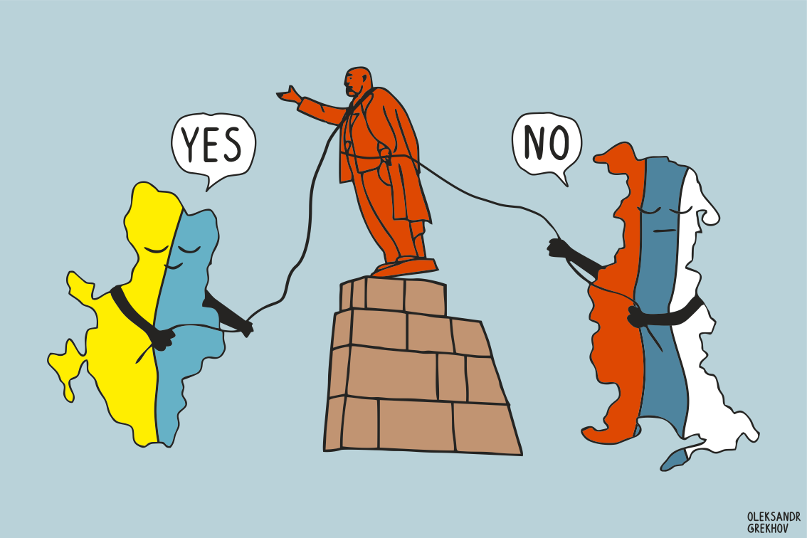 However, Russian citizens have had plenty of time to reflect on things. Russia’s aggression against Ukraine started not a month ago, but back in 2013, as a response to the events of Euromaidan, where Ukrainians expressed that they wanted European integration. Even then, it was repeatedly mentioned that Ukraine was trying to fully break from its Soviet past. During the Revolution of Dignity 2013-2014, local artists dismantled some works of monumental art. They mainly destroyed the sculptural portraits of Bolshevik leaders, scattered across all Ukrainian towns and villages, which have become symbolic of the attempts to destroy Ukrainians through famines, the Executed Renaissance, and the Great Terror. In 2015, the Ukrainian parliament passed a law deemed the communist regime and its symbols as totalitarian and equated them with the Nazis.