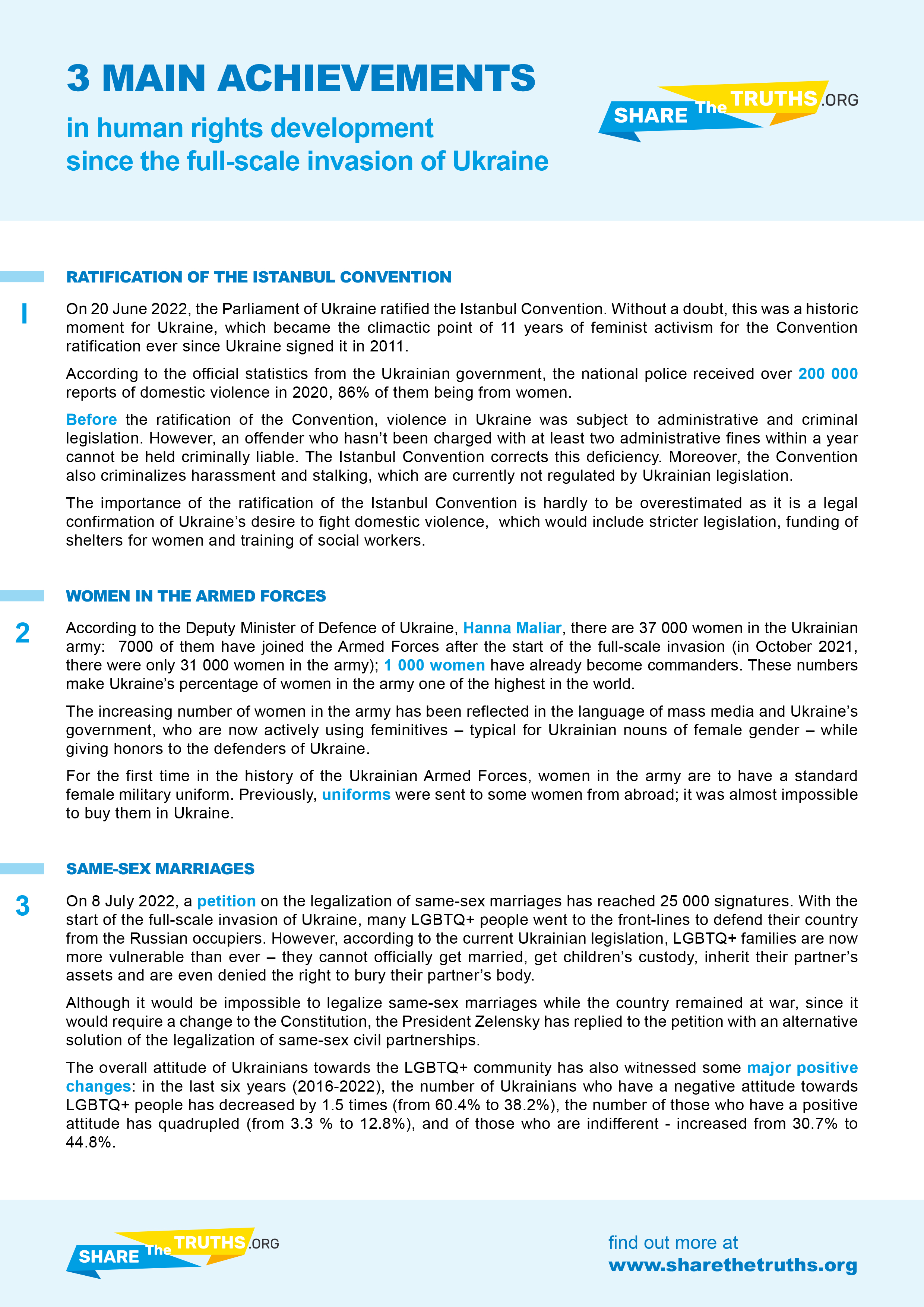 On 8 July 2022, a petition on the legalization of same-sex marriages has reached 25 000 signatures. With the start of the full-scale invasion of Ukraine, many LGBTQ+ people went to the front-lines to defend their country from the Russian occupiers. However, according to the current Ukrainian legislation, LGBTQ+ families are now more vulnerable than ever – they cannot officially get married, get children’s custody, inherit their partner’s assets and are even denied the right to bury their partner’s body.