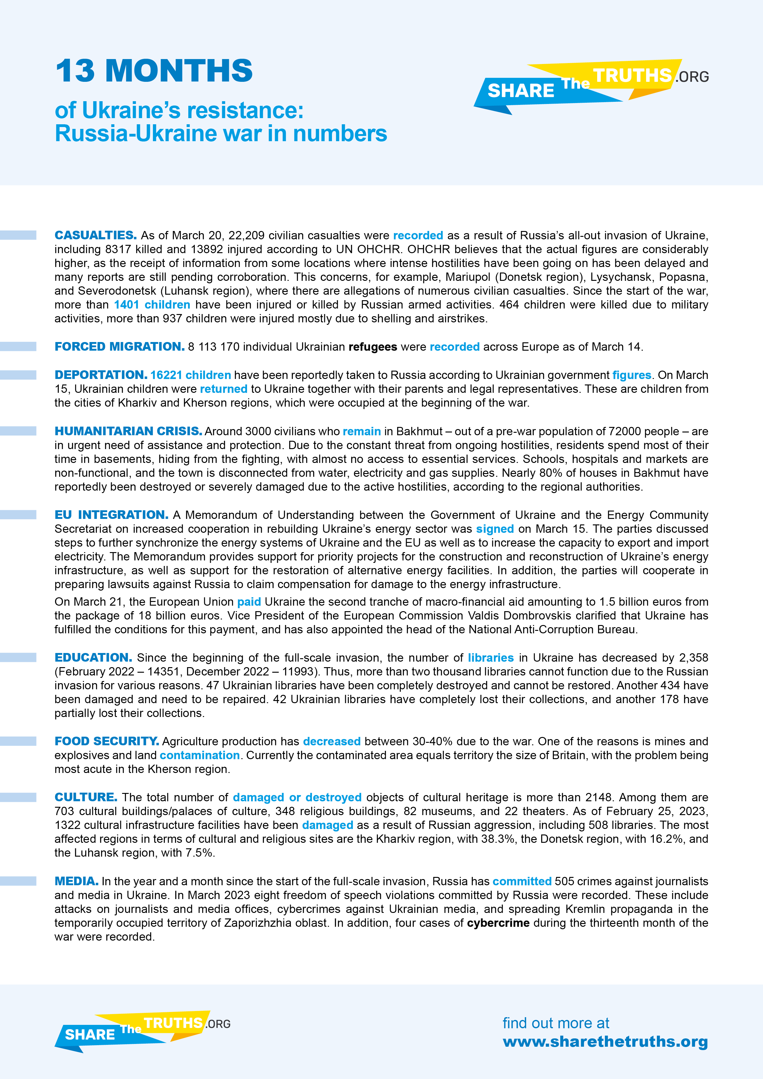 As of March 20, 22,209 civilian casualties were recorded as a result of Russia’s all-out invasion of Ukraine, including 8317 killed and 13892 injured according to UN OHCHR. OHCHR believes that the actual figures are considerably higher, as the receipt of information from some locations where intense hostilities have been going on has been delayed and many reports are still pending corroboration. This concerns, for example, Mariupol (Donetsk region), Lysychansk, Popasna, and Severodonetsk (Luhansk region), where there are allegations of numerous civilian casualties. Since the start of the war, more than 1401 children have been injured or killed by Russian armed activities. 464 children were killed due to military activities, more than 937 children were injured mostly due to shelling and airstrikes.